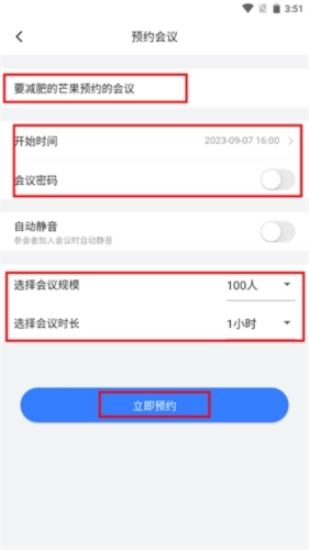 6、可以在预约会议里设置会议名称、开始的时间及会议密码;选择好会议的规模,点击“立即预约”即可