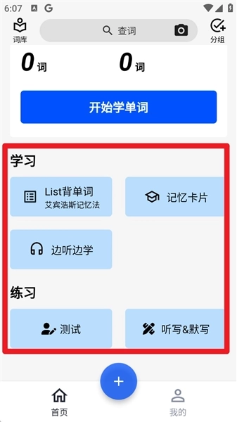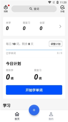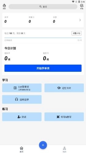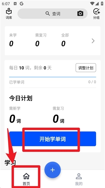 1.进入App后会默认停留在首页页面,点击蓝色的「开始学单词」按钮,就能查看每日任务和复习安排了。