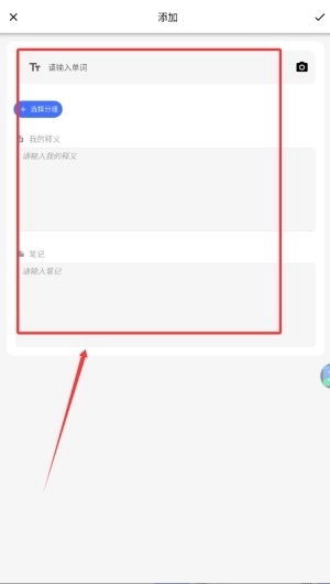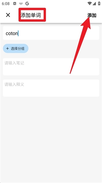4.在添加词页面输入单词、释义与笔记后,点击右上角的「添加」按钮,就能把该词汇保存到词库当中。