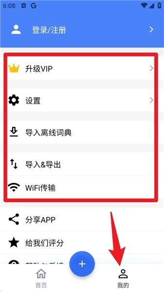 5.点击底部导航栏的「我的」,可以查看账户信息、导入词典,还能开启Wi-Fi同步功能来进行多设备管理。