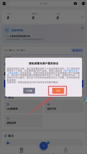 1、当您第一次打开这款软件时,请一定点击同意相关的用户协议,这样才能进入主界面。