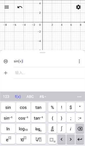 3、我们需要在上方的文本框中输入公式,所以得借助计算器来操作。举个例子,要是我想输入【sin(x)+cos(x)】这个公式,那就先点击一下【f(x)】按钮,接着再点击【sin】按钮。