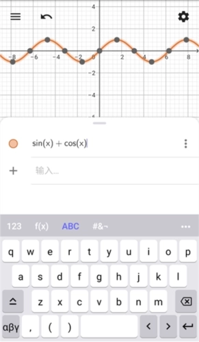 5、随后把鼠标移到【123】的位置,这里包含若干计算工具,我们选中【+】,此时上方的文本框就会插入一个加号,接下来输入cos(x),参照输入sin(x)的操作步骤进行即可。