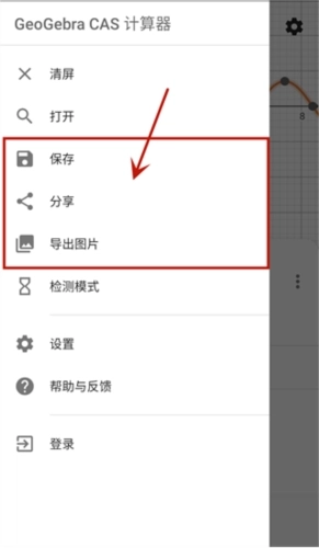 打开GeoGepa计算器套件左上角的菜单,该菜单具备以下功能:创建新文件、打开现有资源、保存文件、分享资源,还能更改设置、切换计算器以及获取帮助。