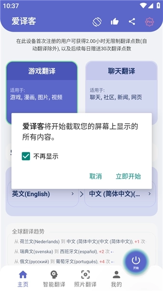 爱译客翻译器免费版是珠海艾贝信息技术有限公司开发的一款屏幕翻译工具,能为用户提供专业、快速又精准的翻译服务,并且支持105种语言(其中包含中文、日文、韩文),市面上常见的语种基本都覆盖在内,可以满足大多数用户的使用需求。当我们出国旅游时,语言不通往往会成为沟通的最大难题,要是碰到这种状况,不妨体验一下爱译客,它能帮你实现实时翻译,从而避免因语言障碍引发的各种问题。