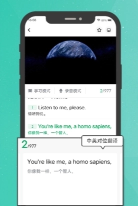 进入「学习模式」,每句台词播放完后自动暂停,方便学习者跟读学习。