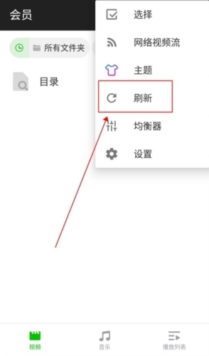 2、弹出界面后,能看到第四个选项是刷新,点击它就能重新扫描手机里的视频。