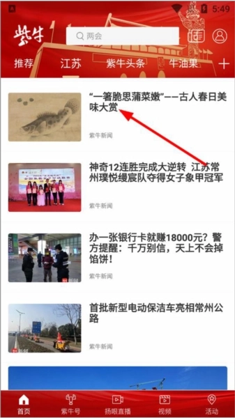 1、打开,登录进入首页,用户可在首页查看推荐新闻、本地新闻、紫牛头条、快讯、时政新闻等,点击新闻;