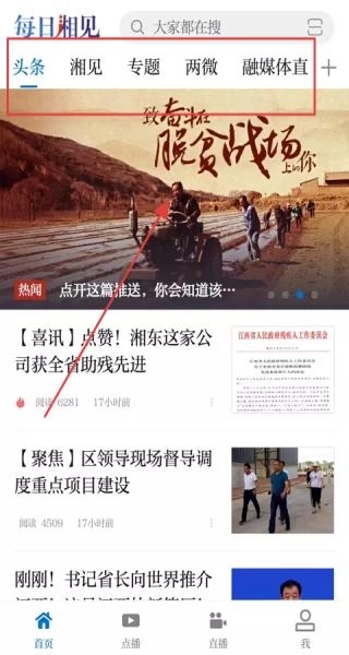 1、在头条栏目查看热点新闻,如湘东这家公司获全省助残先进等,通过湘见专题等板块,了解本地特色及专题内容。