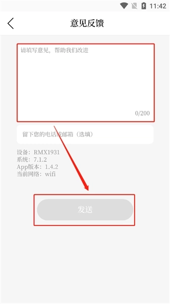 3、在“意见反馈”功能里,您能够填写相关意见,字数请控制在200字以内,之后选择“发送”按钮提交就可以了。