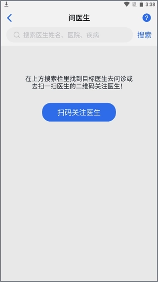 在首页找到并点击【问医生】选项,进入医生页面后,点击【添加医生】按钮,此时可通过扫描医生的二维码来添加该医生,以便后续进行咨询。