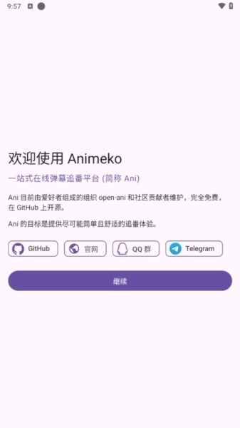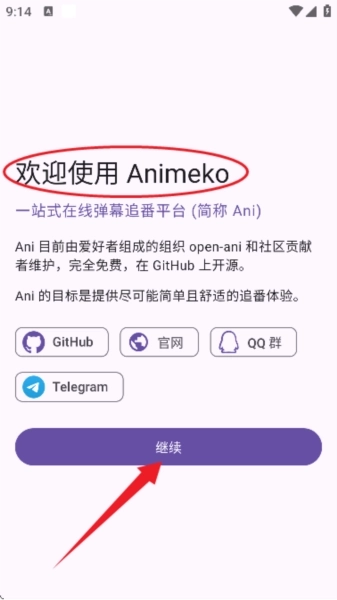 与安装:从提供的链接下载并安装Animeko,打开应用后点击“继续”按钮。