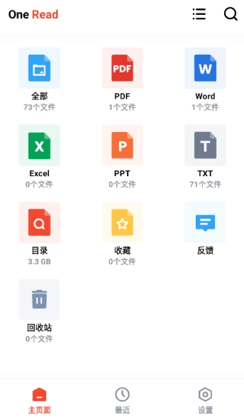 One Read的全称是All Document Reader-One Read,这是一款聚焦于文件管理与阅读的工具类软件。当用户授予相应权限后,软件会自动扫描系统内的文件,并依据文件类型进行分类整理,操作起来十分便捷。不仅如此,One Read还配备了回收站功能,让用户无需再为误删文件而担忧。总的来说,这款软件用起来特别顺手!
