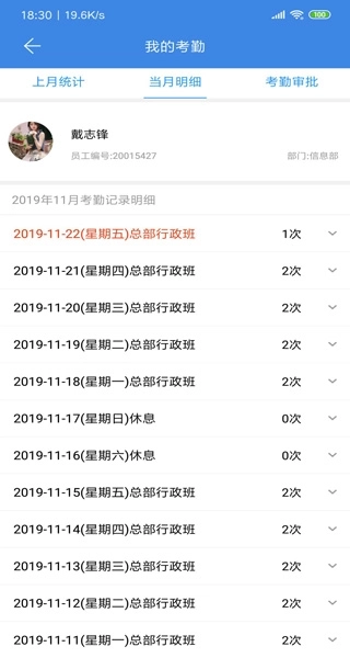 4、我的考勤:可随时查看个人考勤数据,了解上下班的详细情况。