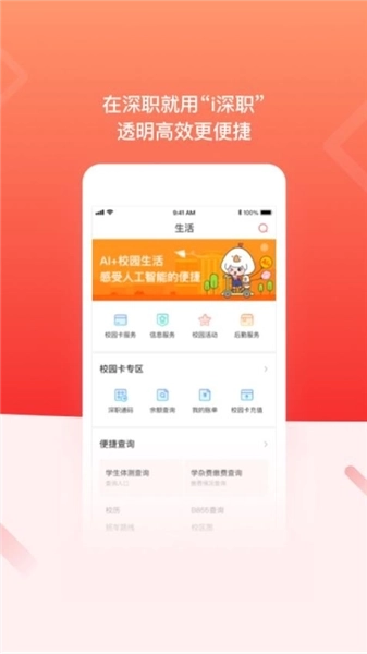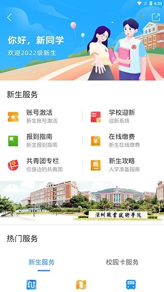 校园卡服务、深职通码、我的账单、余额查询、校园卡充值、校园卡挂失等服务功能