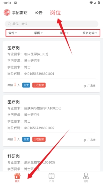 3、也能借助岗位列表查询到招聘信息,具体如图所示。可依据省份、学历、学位、报名时间等条件来筛选岗位信息。
