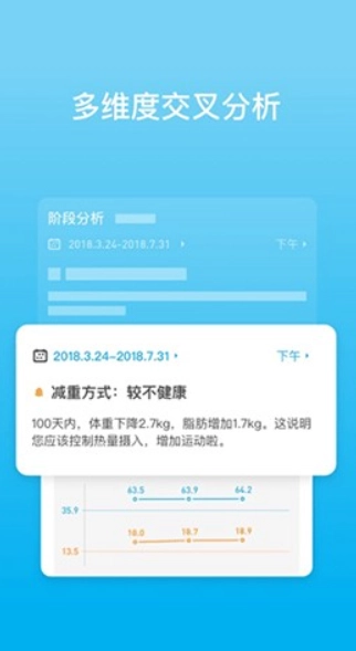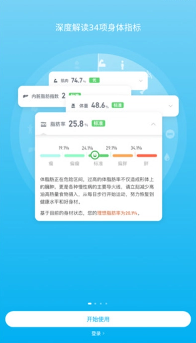 身体成分分析:可对体重、脂肪率、内脏脂肪指数、骨量、水分率等多项体征指标进行监测。