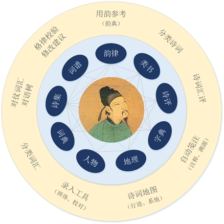 可以按照作者、朝代、体裁、韵部、关键字词及其位置进行精确查询,也能像百度、谷歌那样进行模糊检索。使用关键字词查询时,能够选择查询范围是全诗、诗题还是诗句。查询到诗词之后,可以进一步查看诗词的自动注释、四声标注、引用与出处分析、相似句子分析等内容。