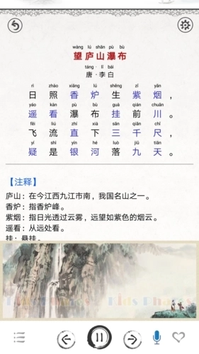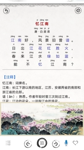 每一首诗词都搭配了“白云出岫”老师饱含深情的朗诵,标注了精准的拼音,附上了详尽的注释,配有优美的译文,提供了浅显易懂的启示,讲述了生动有趣的故事,还配有雅致的水墨风格图画,以及实用且便于操作的跟读背诵学习功能。