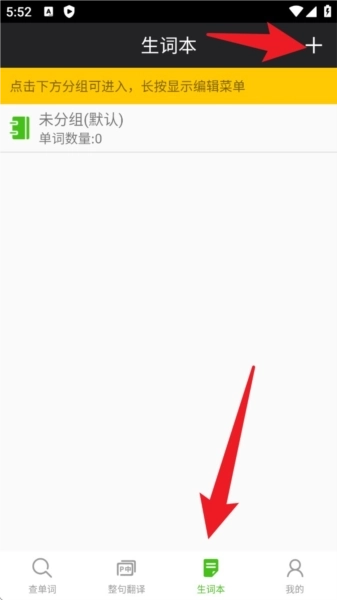 5.点击页面底部的“生词本”选项,进入到单词管理界面后,通过点击右上角的“+”按钮来新建分组,然后将需要记忆的单词添加进去。
