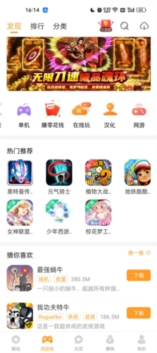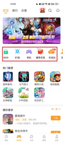 1、首页设有MOD、BT版、在线玩、单机、网游等分类板块,同时还展示着平台推荐的各类精品游戏。
