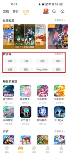 3、进入发现页面后,能看到角色、卡牌、动作、挂机、放置、模拟、冒险等各类游戏,玩家可根据喜好自行挑选;