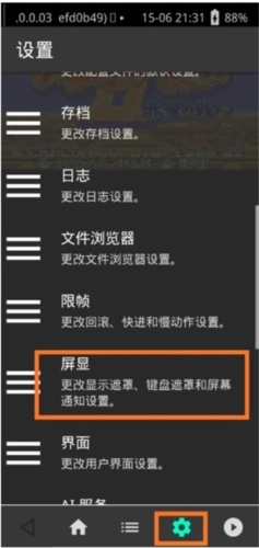 1、保持手机处于运行状态,同时确保有一款游戏正在运行,接着打开游戏内的菜单,从中选择齿轮形状的图标,随后找到“屏显”相关选项并点击它。