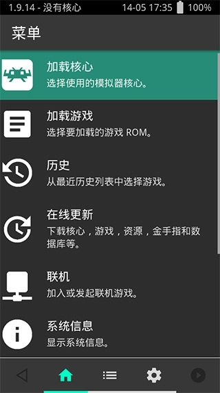 加载核心、加载游戏、历史记录、在线更新、联机对战、系统信息