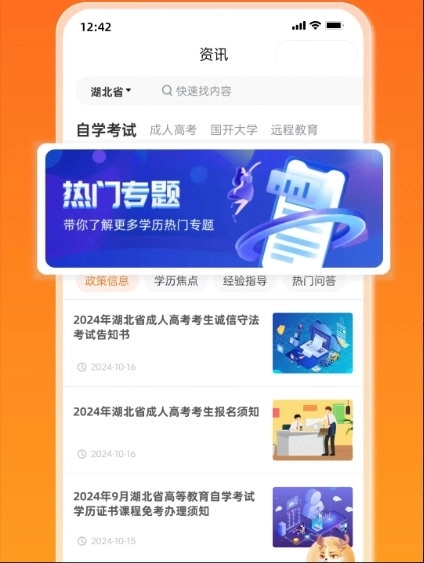 橙鹿学历宝是橙鹿教育科技(湖北)有限公司专为广大学生打造的一款学习平台,在这里大家可以高效率的获得正规学历,让你可以前往知名高校或联合办学单位进行学习,从而考出需要的学历!在橙鹿学历宝中,用户能够去直面高校,各大高校在这里都有入驻招生,以便你去选择,同时平台上也是有着非常多的学习内容。用户还可以选择习题进行刷题练习,便捷的进行专业的学习,轻松备考学历考试。平台海湖一堆用户的学历进行规划陪跑,这里的学历专家会对用户进行专业的辅导,轻松进行答疑避坑,让你可以快速拿证。此外,橙鹿学历宝还提供了实时的院校资讯,对考试动态和院校专业信息都可以查看,专业提升学历,有需要的用户就赶紧来本站使用吧!