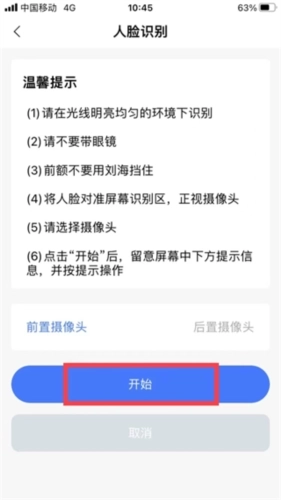 4、按照系统提示,选择“前置摄像头”或“后置摄像头”,点击“开始”进入人脸识别界面,随后依据系统界面的指引完成“人脸识别认证”就可以了。