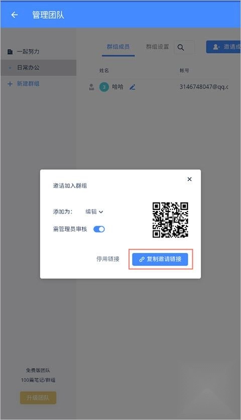 2、进入界面后,点击右上角的“邀请成员”按钮,会弹出多种邀请好友的方式,选择其中一种即可(此处以复制链接为例)。