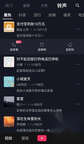 7、点击“铃声”选项,即可看到抖音、流行、经典、搞笑、电音等各类热门铃声供你挑选。