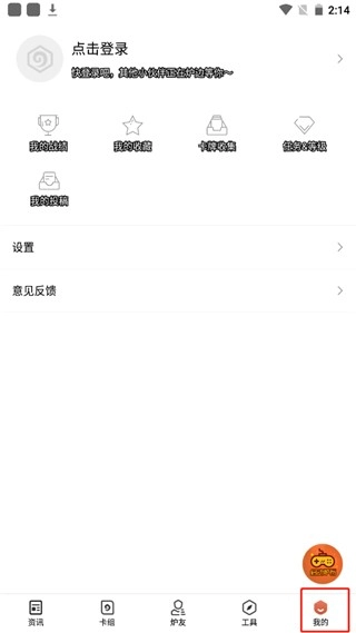 5、点击“我的”,用户登录后,该页面会展示其战绩、收藏、卡牌收集情况以及任务等级等信息。