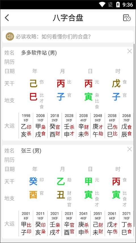 3、所有内容填写完成后,点击合盘按钮,就能得到详细的合盘结果。