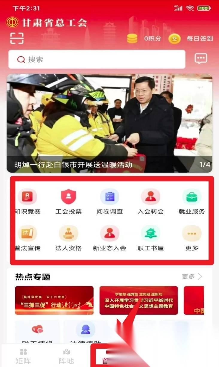 1. 点击底部的“首页”进入导航界面,即可使用投票、入会、就业等各类服务入口;