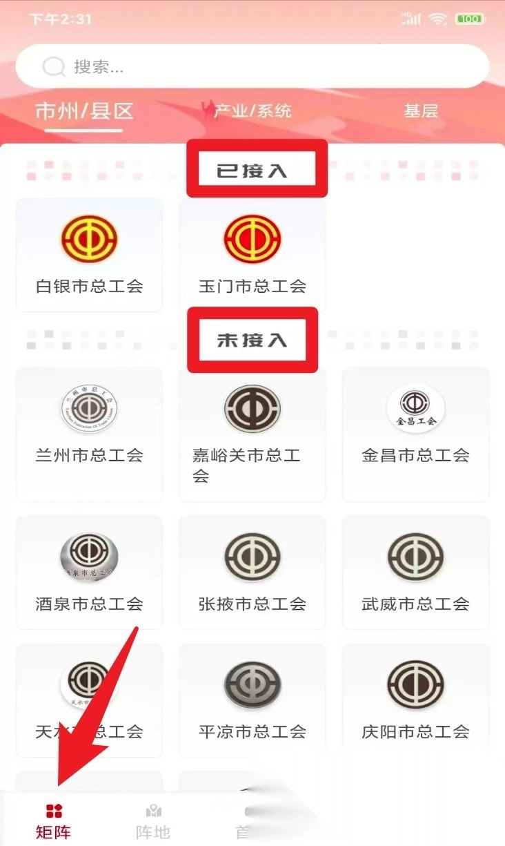2. 进入“矩阵”板块,查看各市州及产业工会的接入状态并选择访问;
