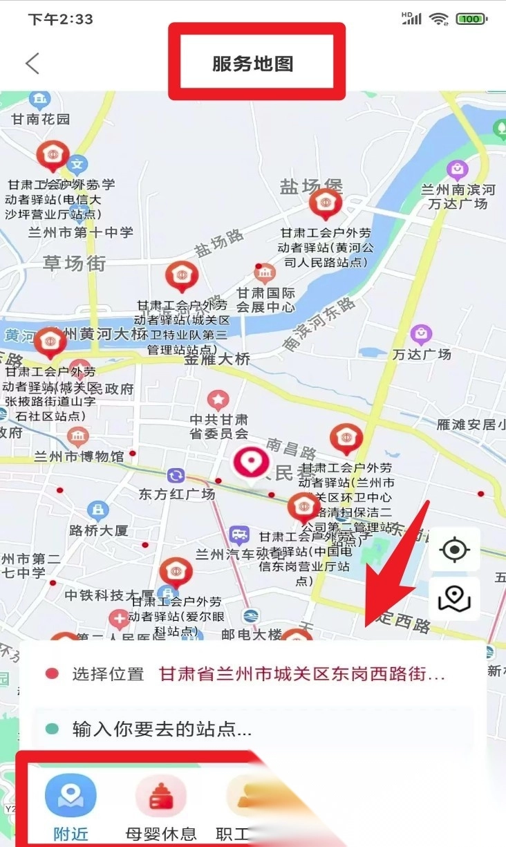 3. 借助“阵地”板块里的“服务地图”功能,查找周边工会服务点及其具体地址。