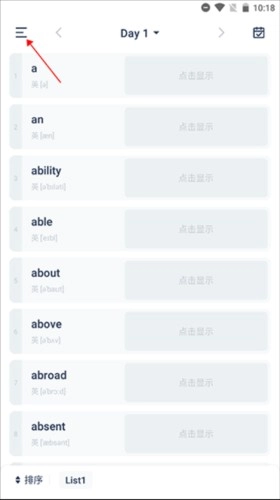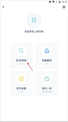 1、打开炭炭背单词后,点击页面左上角【三图标】。