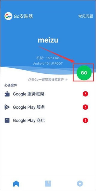 1、启动软件后,系统会自动检测谷歌三件套的安装状态。若某项谷歌套件未安装,其后方会显示红色感叹号提示,此时用户只需点击右侧的绿色GO按钮,等待片刻就能完成安装操作。