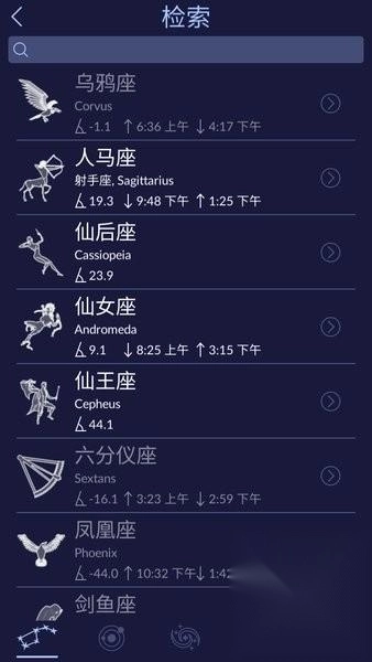 进入“检索”后,里面包括了银河中的各大星座,点击就可以查看对应的星座。