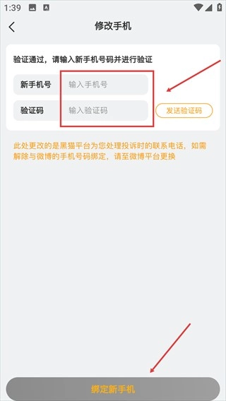 4、输入新手机号和验证码,填写后点击“绑定新手机”,完成手机号的更换操作。