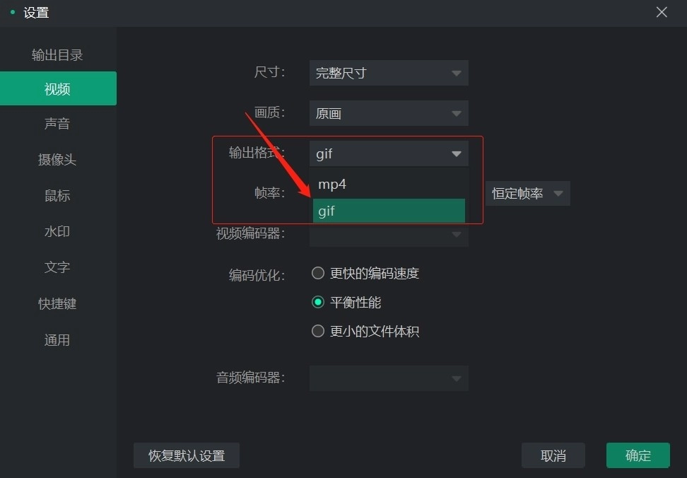 打开设置-视频设置,找到输出格式,选择gif