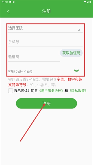 在注册页面操作时,需先点击【选择医院】进行选择,接着填写【手机号】,然后点击【获取验证码】,勾选相关协议后点击【注册】按钮,即可完成账号创建。