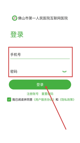 1、打开【佛山市第一人民医院互联网医院】的登录界面,输入【手机号】和【密码】,勾选相关协议后点击【登录】按钮,即可进入平台使用各项医疗服务。