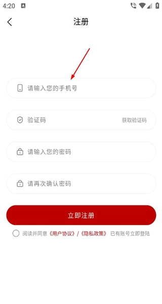 4、进入注册页面后,按顺序填写手机号、验证码和密码,勾选相关协议,最后点击对应按钮,就能完成账号注册。