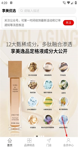 1、进入享美优选首页,能查看产品成分的相关介绍,点击底部的对应按钮,即可进入会员中心页面。