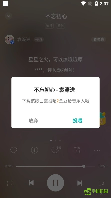 2、在这里会提示需要向音乐人投喂金豆,完成投喂操作后,就能将内容保存至手机本地。