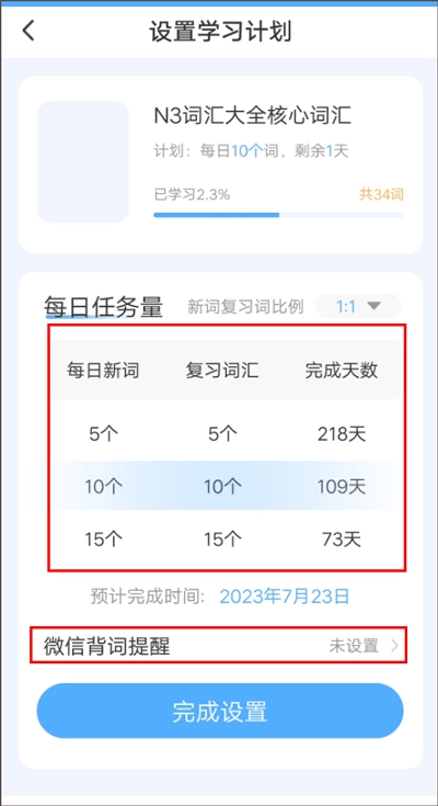 3、规划学习安排,设定每日背诵任务,还能开启微信提醒功能。