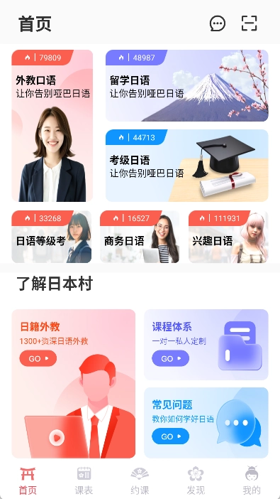 日本村日语是一款高效的日语在线学习软件,它为用户营造了轻松有趣的学习氛围,让大家能在人际互动中自然培养语感,进而全面提升日语口语表达能力。这款软件的学习时间十分灵活,用户可自主利用各类碎片时间进行学习。此外,软件还配备了大量经过严格筛选的日本本土外教,他们能为用户提供原汁原味的地道日语发音!