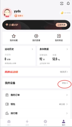 1、打开运动应用并登录后,进入个人中心页面,在“我的设备”模块里找到添加按钮。